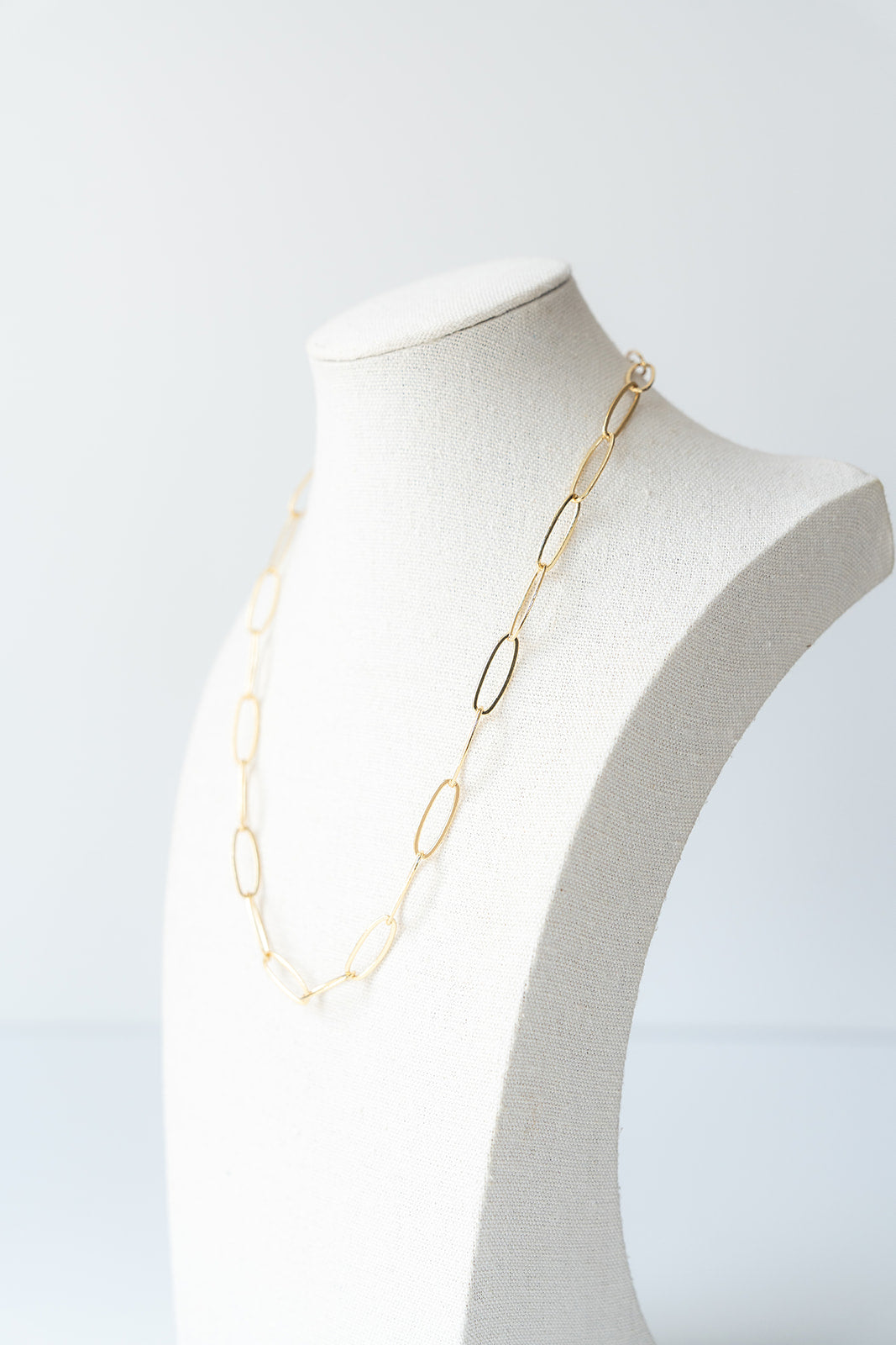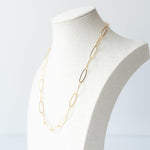 Sleek, flat oval paperclip links give this chain its dainty-yet-oversized and handmade vibe. Dramatic enough to turn heads on vacation nights out, simple enough to wear every day. Light as a feather, you may forget you have this one on. Works well as a long or short style chain, with or without charms.