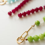 Hand-strung with shiny, polished gemstone beads, the High Tide version of the Tidewater necklace features a slightly chunkier bead than it's mate the Low Tide. The High Tide runs about 1.5-2" longer in length than the Low Tide, making them a perfect combo to wear together. With the varying necklace lengths and bead shapes, they also pair nicely with our paperclip chains, charm necklaces, and Candy Necklaces. Approximately 18-19" long.