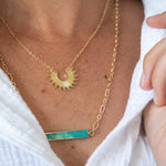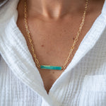 A slim turquoise bar strung on a slim, textured golden sunshine chain - bringing together our favorite Caribbean blues and midwest desert greens in one vibrant piece that feels both global and grounded. Add a tiny shell to the bar to beach it up a notch, pair it with a Tidewater and golden sunshine necklace to feel the earth's breeze no matter where you are.